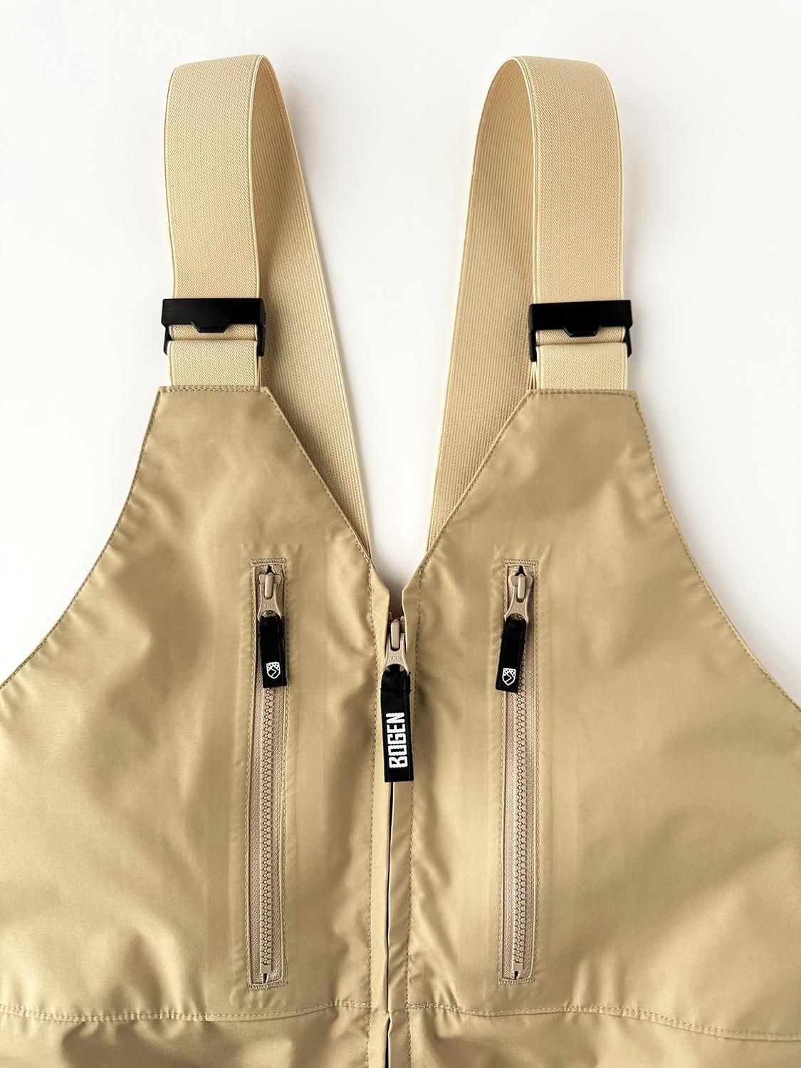 ボーゲンのスタンダードビブパンツ。今季は"すっきりしたゆったり感"へ進化。胸あての形状を変えたら、ビブパンツに軽快感が出た。腰ポケットの位置も前に移動してより使い勝手が良くなった。
